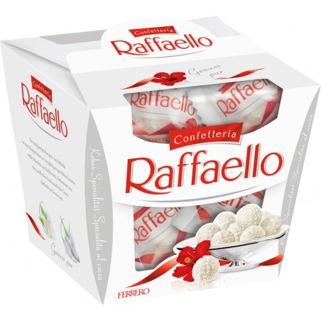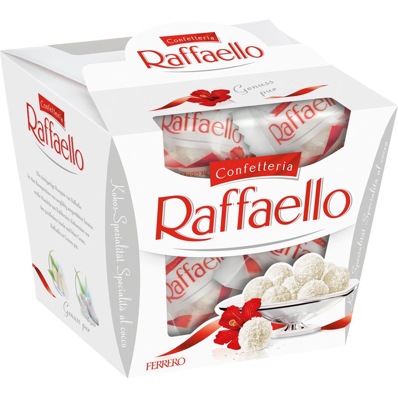 RAFFAELLO Kokos-Mandel-Konfekt weisse Mandel, eingebettet in feine Milchcreme mit dem Besten aus entrahmter Milch, umhüllt mit knuspriger Waffel und zartem Kokos. Packung zu 150 g.