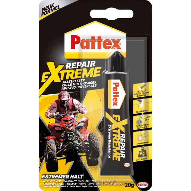 PATTEX® Alleskleber Repair Extreme Gel universeller Reparaturkleber, klebt fast alle Materialien, spaltfüllend, präziser Halt dank gelartiger Konsistenz, innovative Flextec-Technologie, elastisch, dehn-, vibrations-, wasser- und temperaturbeständig von -50 bis +120°C, geruchlos, lösungsmittelfrei.