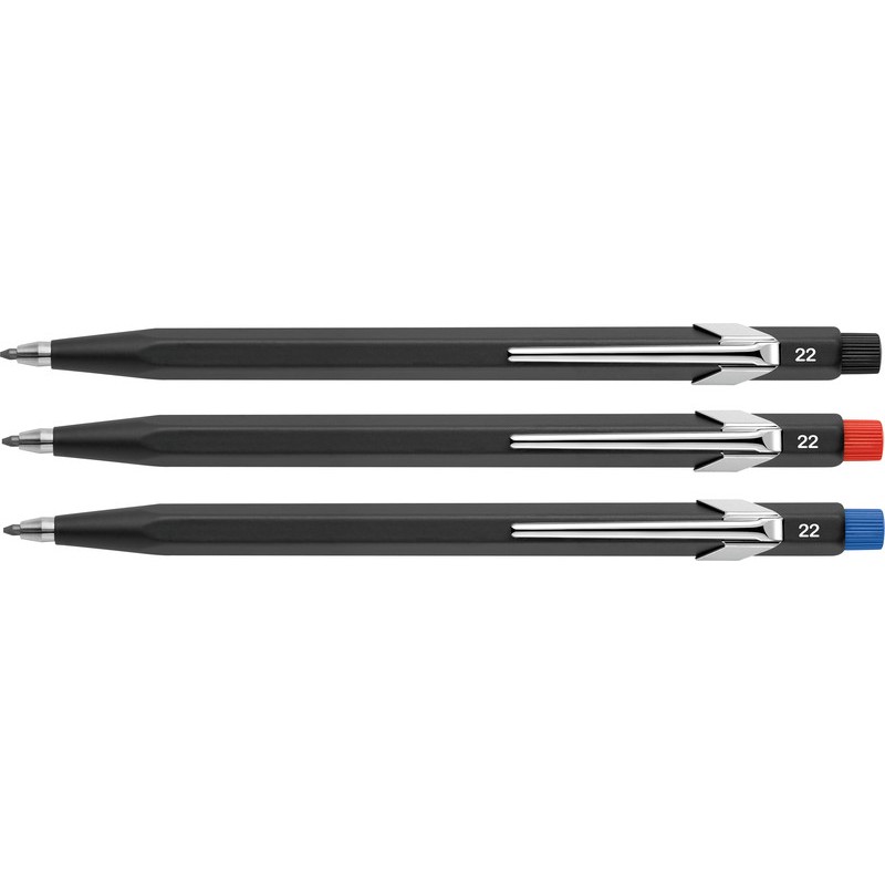 CARAN D'ACHE Druckbleistift FIXPENCIL(TM) 22 kantig, Länge 135 mm, Metallclip, mit Minenspitzer, für 2 mm Minen 6077, Knopf farbig sortiert, rot, blau und schwarz.