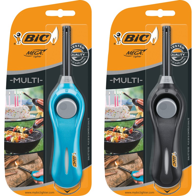 BIC® Multifunktionsfeuerzeug Megalighter U140 ergonomischer Kunststoffgriff, einfache und komfortable Zündvorrichtung (60 mm) dank Druckknopf, Gasstandanzeige, nicht nachfüllbar, farbig sortiert, türkis und schwarz.