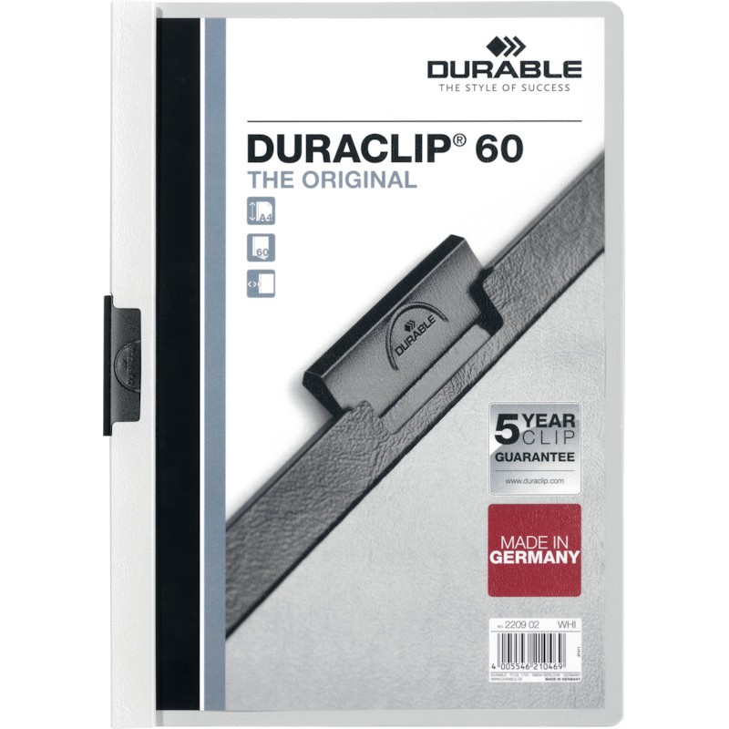 DURABLE Klemmhefter Duraclip® 60 für ungelochtes Schriftgut, Vorderdeckel transparente Hartfolie, Rückendeckel farbig, Klemme aus Stahl, Fassungsvermögen bis 60 Blatt 80 g/m2, für Format A4. Garantie: 5 Jahre auf die Klemme. Nachhaltigkeit eco:plus: recyclingfähig, recycelter Bestandteil, Recycelgehalt Abfall vor Gebrauch max. 5%, Recycelgehalt Abfall nach Gebrauch max. 2%.