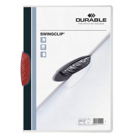 DURABLE Klemmhefter Swingclip® aus transparenter, flexibler Hartfolie PP, farbige, elipsenförmige, seitlich schwenkbare Kunststoffklemme, Fassungsvermögen bis 30 Blatt 80 g/m2, für Format A4. Nachhaltigkeit eco:plus: recyclingfähig.