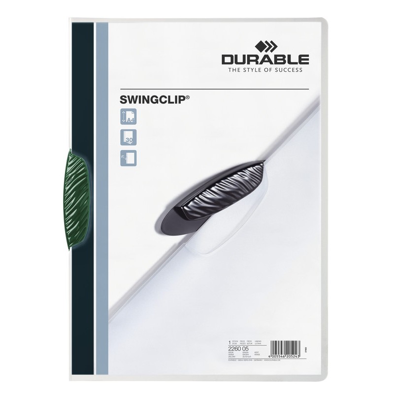 DURABLE Klemmhefter Swingclip® aus transparenter, flexibler Hartfolie PP, farbige, elipsenförmige, seitlich schwenkbare Kunststoffklemme, Fassungsvermögen bis 30 Blatt 80 g/m2, für Format A4. Nachhaltigkeit eco:plus: recyclingfähig.
