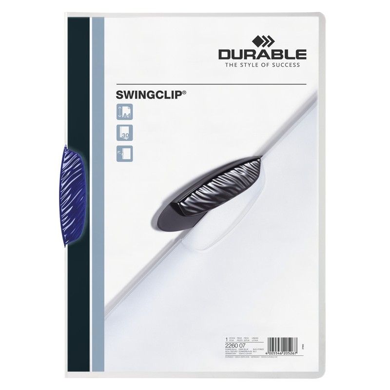 DURABLE Klemmhefter Swingclip® aus transparenter, flexibler Hartfolie PP, farbige, elipsenförmige, seitlich schwenkbare Kunststoffklemme, Fassungsvermögen bis 30 Blatt 80 g/m2, für Format A4. Nachhaltigkeit eco:plus: recyclingfähig.