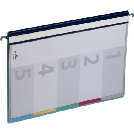 DURABLE Organisationshefter Divisoflex® Vorderdeckel transparent als A4-Sichttasche mit Inhaltsverzeichnis, Rückendeckel blau, fünffache Unterteilung mit Grifftaben, Beschriftungsstreifen über die ganze Höhe, einfache Beschriftung mit kostenloser Beschriftungssoftware Duraprint® unter www.duraprint.de, pro Unterteilung 2 Hefterstifte für Lochungen 80 mm, Fassungsvermögen bis 100 Blatt, für Format A4. Nachhaltigkeit eco:plus: recyclingfähig.