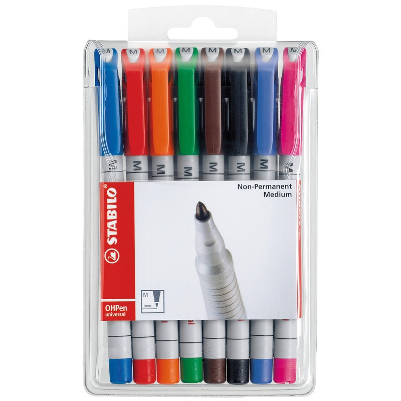 STABILO® OHPen universal wasserlöslich Clip, universell einsetzbarer Folienschreiber, nicht nur für Folien geeignet, sondern auch für den Einsatz auf fast allen glatten Oberflächen, wasserlösliche Tinte, feucht abwischbar, nicht nachfüllbar. Nachhaltigkeit eco:plus: umweltfreundliche Verpackung. mittel (M), Strichbreite ca. 1 mm