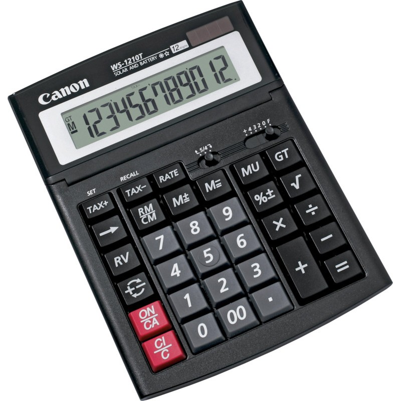 CANON Tischrechner WS-1210T mit neigbarer 12-stelliger LCD-Anzeige, 1 Speicher, Prozent-, +/-, Wurzel-, Umkehr-, Rundungs- und 00-Taste, Steuerberechnung. Stromversorgung: Solar- und Batteriebetrieb (LR44). Masse: B 150 x H 38 x T 198 mm. Gewicht: 238 g. Preis inkl. VRG. Nachhaltigkeit eco:plus: verlängertes Produktleben, recycelter Bestandteil.