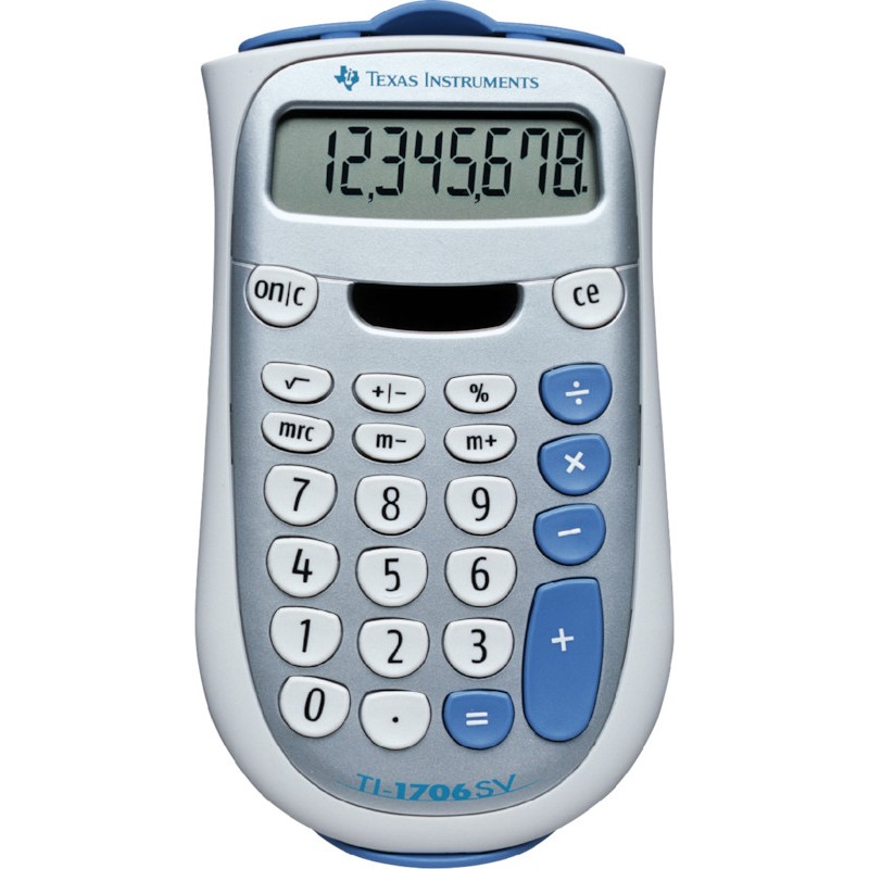 TEXAS INSTRUMENTS Grundrechner TI-1706 SV mit 8-stelliger LCD-SuperView-Anzeige, 4 Rechenarten, +/- Taste - Prozent- und Wurzeltaste, freier Speicher, Nachkommastellen, APD(TM) (Automatic Power Down - automatisches Ausschalten) für eine längere Lebensdauer der Batterie. Stromversorgung: Solar- und Batteriebetrieb. Masse: B 78 x H 20 x T 114 mm. Gewicht: 85 g. Preis inkl. VRG.