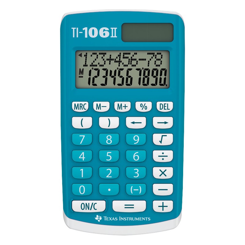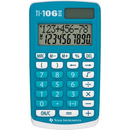 TEXAS INSTRUMENTS Schulrechner TI-106 ll für die Primarstufe, mit 8-stelliger Anzeige, 2 Zeilen, Prozent- und Wurzeltaste, +/- Taste, Rechnung und Ergebnis auf einen Blick, Punkt vor Strichrechnung, mit Schiebeetui. Stromversorgung: Solar- und Batteriebetrieb (CR1220). Masse: B 70 x H 15 x T 125 mm. Gewicht: 73 g. Garantie: 3 Jahre. Preis inkl. VRG.