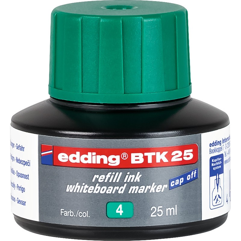 EDDING® Board Marker Tusche BTK 25 Pigmenttusche mit Kapillarsystem zum Nachfüllen der Board Marker EDDING® 28, 29, 250, 360, 361 und 363, Cap-off-Tusche: bis zu 6 Wochen offen lagerfähig ohne einzutrocknen. Flasche zu 25 ml. Nachhaltigkeit eco:plus: recyclingfähig.