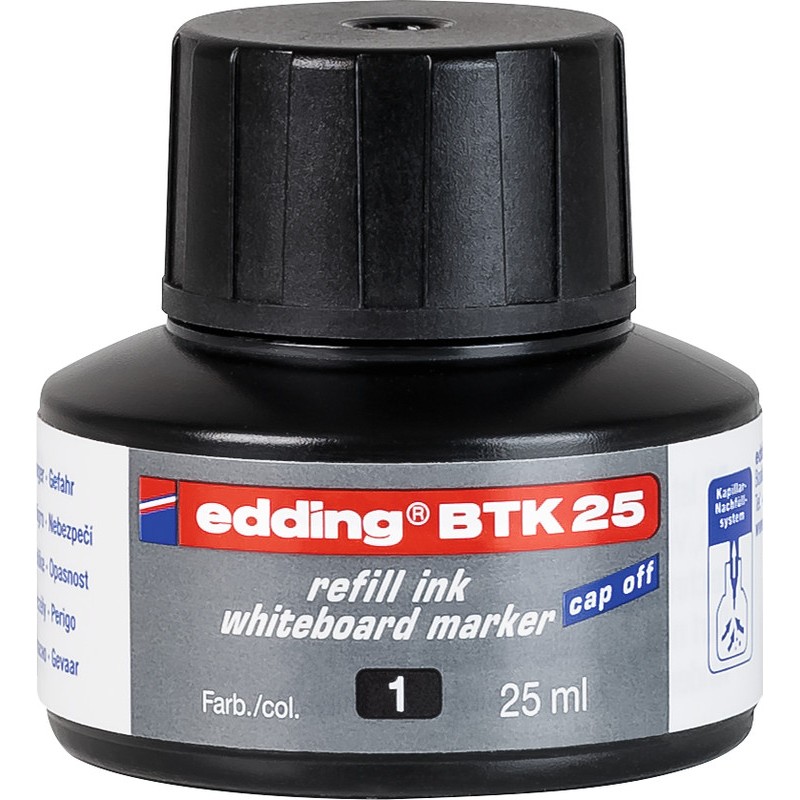 EDDING® Board Marker Tusche BTK 25 Pigmenttusche mit Kapillarsystem zum Nachfüllen der Board Marker EDDING® 28, 29, 250, 360, 361 und 363, Cap-off-Tusche: bis zu 6 Wochen offen lagerfähig ohne einzutrocknen. Flasche zu 25 ml. Nachhaltigkeit eco:plus: recyclingfähig.