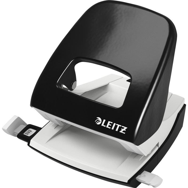 LEITZ® NeXXt Serie Locher (Metall) 5008 Unterteil und Griff aus robustem Metall, für 8 cm Lochabstand, Loch Ø 5,5 mm, Anschlagschiene mit farbiger Bedruckung und Fenster, ultra-scharfe Lochstempel, patentierte Griffmulde für leichtes Lochen, Stanzvermögen 3 mm (30 Blatt). Garantie: 10 Jahre. Zertifikat: GS.