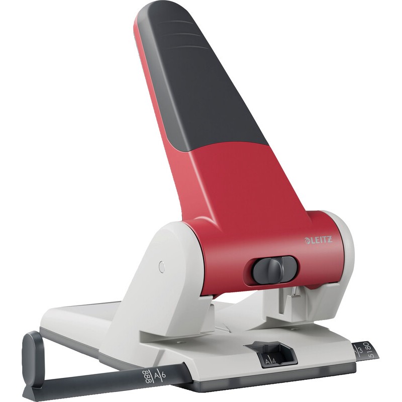 LEITZ® extrastarker Registraturlocher 5180 aus Aluminium-Druckguss und Kunststoff, 34% recyceltem Kunststoff (Post-Consumer), Unterteil grau, für 8 cm Lochabstand, Loch Ø 5,5 mm, abgeschrägte ABS-Anschlagschiene (Lochung bis Format A3 möglich) und integrierter Griffniederhalter, langer, ergonomischer Griff für optimale Kraftübertragung, Stanzvermögen ca. 6,5 mm (65 Blatt). Garantie: 10 Jahre.