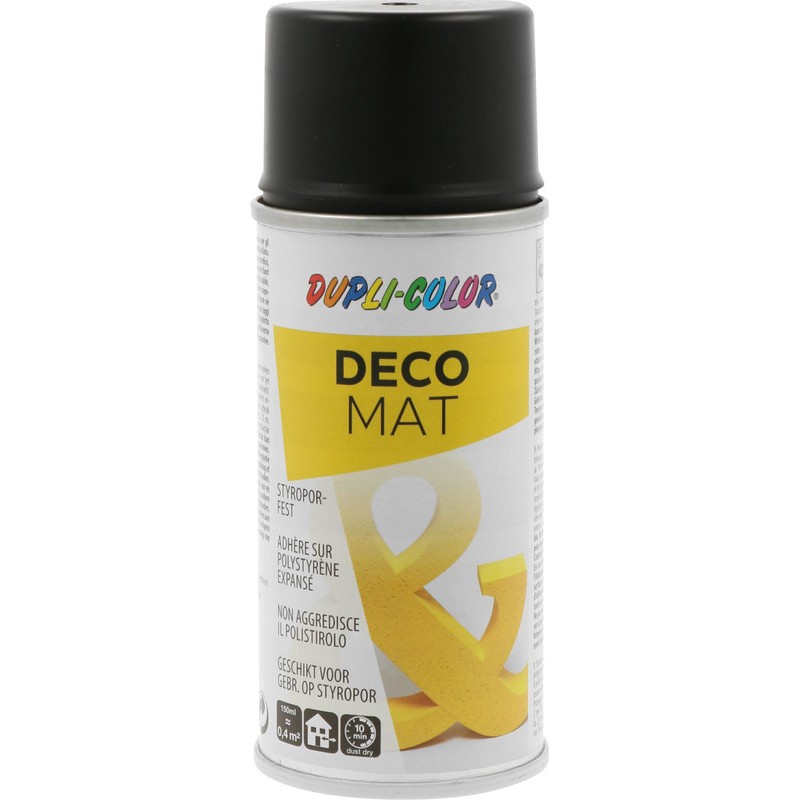 DUPLI-COLOR® Farbspray Deco Mat matt, styroporfester Acryllack mit Speziallösemittel, deckend, gleichmässiges Farbergebnis, trocknet schnell, staubtrocken nach ca. 10 Min., grifffest nach 30 Min., durchgetrocknet nach ca. 24 Std., hält dauerhaft im Innen- und Aussenbereich, kratz-, stoss- und schlagfest, lichtecht, UV-Beständig, geeignet für Styropor, Metall, Holz, Glas, Keramik, Eternit, Beton, Stein, Papier, Karton, lackierfähige Hartkunststoffe, Blumen usw. Dose zu 150 ml.