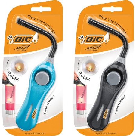 BIC® Multifunktionsfeuerzeug Megalighter Flex Relax mit flexiblem Hals, ergonomischer Kunststoffgriff, einfache und komfortable Zündvorrichtung (110 mm) dank Druckknopf, Gasstandanzeige, nicht nachfüllbar, farbig sortiert, türkis und schwarz.