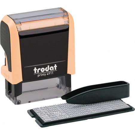 TRODAT® Typomatic Printy(TM) 4.0 Pastell Edition, selbstfärbender Stempel zum Selbersetzen serienmässig CO2 kompensiert produziert, mit auswechselbarem TRODAT® Stempelkissen schwarz. 4911 typo, Textplatte 38 x 14 mm max. 3 Zeilen Text. 1 Set Gummitypen 3 mm Schrifthöhe (336 Zeichen). Ersatzkissen 6/4911.