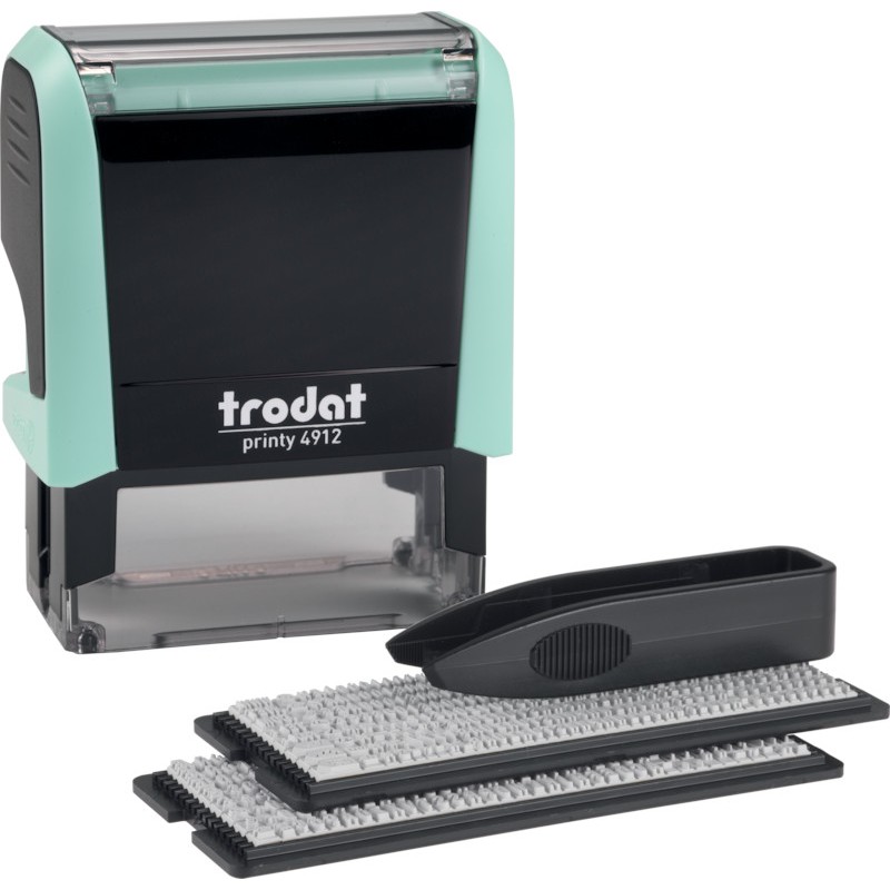 TRODAT® Typomatic Printy(TM) 4.0 Pastell Edition, selbstfärbender Stempel zum Selbersetzen serienmässig CO2 kompensiert produziert, mit auswechselbarem TRODAT® Stempelkissen schwarz. 4912 typo, Textplatte 47 x 18 mm max. 4 Zeilen Text. 1 Set Gummitypen 3 mm Schrifthöhe (336 Zeichen) und 1 Set Gummitypen 4 mm Schrifthöhe (288 Zeichen). Ersatzkissen 6/4912.