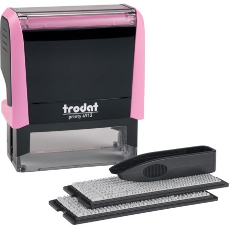 TRODAT® Typomatic Printy(TM) 4.0 Pastell Edition, selbstfärbender Stempel zum Selbersetzen serienmässig CO2 kompensiert produziert, mit auswechselbarem TRODAT® Stempelkissen schwarz. 4913 typo, Textplatte 58 x 22 mm max. 5 Zeilen Text. 1 Set Gummitypen 3 mm Schrifthöhe (336 Zeichen) und 1 Set Gummitypen 4 mm Schrifthöhe (288 Zeichen). Ersatzkissen 6/4913.