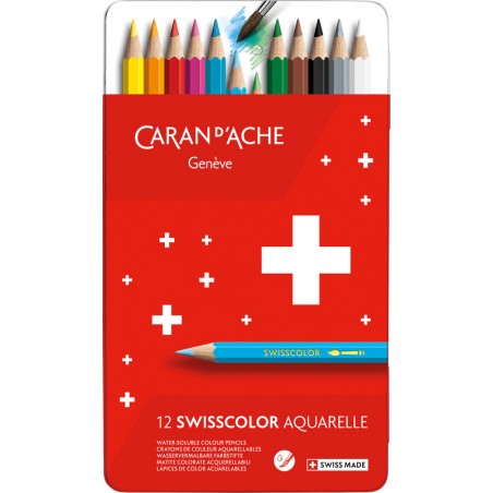CARAN D'ACHE Farbstifte Swisscolor(TM) Aquarelle wasservermalbare Aquarellfarbstifte, lichtechte Farben, hohe Deckkraft, feine Mine Ø 2,8 mm, geeignet für Trocken- und Nasszeichnen, Aquarelle, Feinzeichnen und Malen, für Nachwuchskünstler und Familien. Nachhaltigkeit eco:plus: umweltfreundliche Verpackung. Zertifikat: FSC. in Metallschachtel