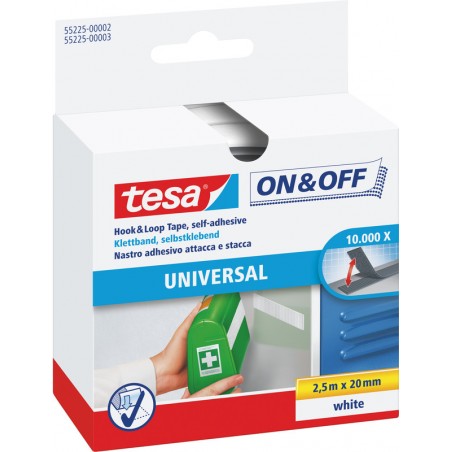 TESA® on&off Klettband universal zum Aufkleben Allzweck-Klettband, selbstklebend, hält leichte Gegenstände und Textilien, 10000 Mal öffnen und schliessen.
