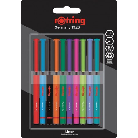 ROTRING Fineliner Nadelspitze, Kappe mit Clip, Schaft in der Schreibfarbe, farbstoffbasierte Tinte, kunstofffreie Verpackung, nicht nachfüllbar, Strichbreite 0,4 mm.