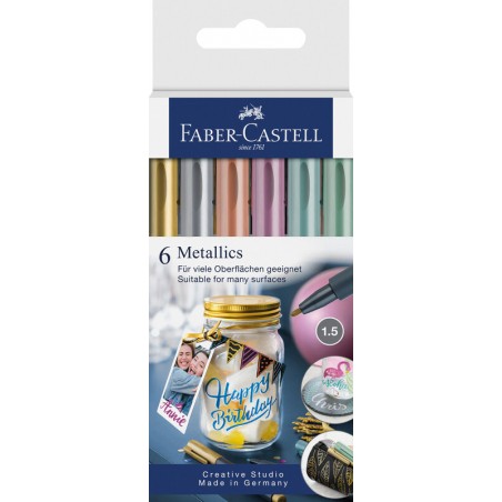 FABER-CASTELL Marker Creative Studio Rundspitze, Clip, zum Bemalen und Beschriften von fast allen Oberflächen, z. B. Papier, Karton, Metall, Kunststoff, Glas und Stein, Tinte auf Wasserbasis, geruchsneutral, wisch- und spritzwasserfest, wasserfest nach Fixierung bei 160°C im Backofen (nicht spülmaschinenfest), schlägt nicht durchs Papier, nicht nachfüllbar, Strichbreite 1,5 mm. Metallic 6er Blister (heart of gold, nothing else metals, copper cabana, berry nice,