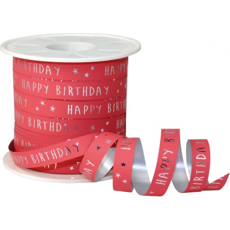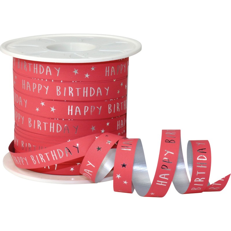 PRÄSENT Geschenkband Happy Birthday Rolle aus 100% recyceltem Material, Kunstband zum Kräuseln, Rolle 10 mm x 100 m. Nachhaltigkeit eco:plus: recyclingfähig, Recycelgehalt Abfall vor Gebrauch max. 100%, Recycelgehalt Abfall nach Gebrauch max. 100%, umweltfreundliche Verpackung.