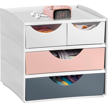 CEP Schubladenelement MyCube aus schlagfestem PS, 100% recycelbar, mit 4 Schubladen, 2 Standartschubladen und 2 Halbschubladen, Auszugsstopp und Schubladeneinzug, mit Gummifüssen, stapelbar. Aussenmasse: B 185 x H 175 x T 186 mm.
