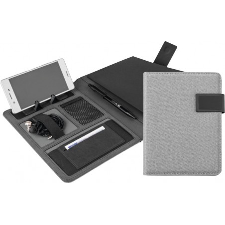 BLACKMAXX® Schreibmappe Metropolis A5 aus Textilmaterial, mit Magnetverschluss, Blockhalterung inkl. Schreibblock, Schreibgeräthalterung, Kartenfach, Einstecktasche, Gummizugschlaufen für die Ablage von Kleinmaterial oder Smartphone, aufklappbare Halterung für Smartphone oder Tablet, für Format A5. Masse: B 170 x H 225 x T 22 mm.