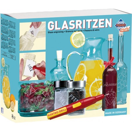 PEBARO Bastelset Glasritzen 12-teilig. Set zu elektischer Gravierstift Elektro-Drill, 2 Gläser, Flachzange, Fettstift weiss, Handgravierstift, keramischer Aufsatz spitz, 2 Diamantenschleifstifte, Kontrasttuch schwarz und Anleitung. Stromversorgung: 2 Batterien AA (nicht mitgeliefert).