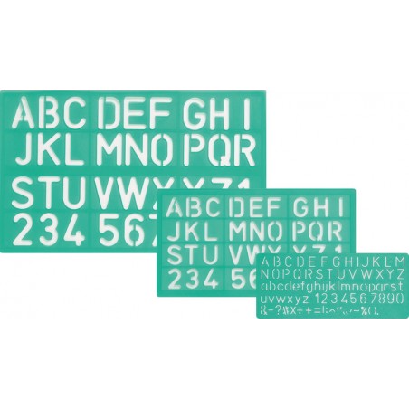 LINEX® Schriftschablonen aus PP, grosse und kleine Buchstaben, Zahlen und Symbole, Ø 10 mm, 20 mm und 30 mm, mit Tuschenoppen. Set zu 3 Stück.