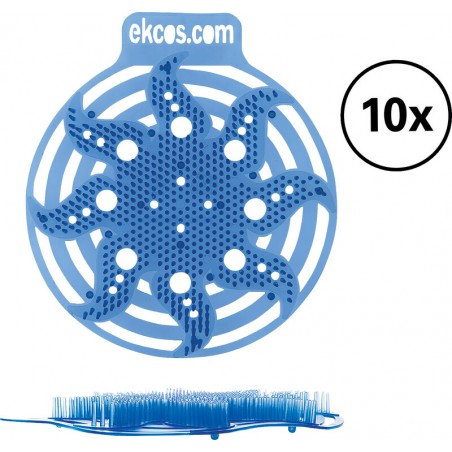 EKCOS Urinalmatten Powerscreen aus Kunststoff, Matte mit den Borsten nach oben in das Urinal legen, flexibles Kunststoffsubstrat passt sich allen Urinalformen an, die versiegelten Borsten verhindern Spritzer im Urinal, grosse Grundfläche für Spritzschutz, verhindert das Verstopfen des Abflusses, Duftharzimprägnierung für konstante Duftabgabe bis zu 30 Tagen, für konventionelle und wasserlose Urinale geeignet, biologisch abbaubar. Schachtel zu 10 Stück.
