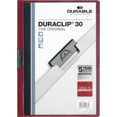 DURABLE Klemmhefter Duraclip® 30 für ungelochtes Schriftgut, Vorderdeckel transparente Hartfolie, Rückendeckel farbig, Klemme aus Stahl, Fassungsvermögen bis 30 Blatt 80 g/m2. Garantie: 5 Jahre auf die Klemme. Nachhaltigkeit eco:plus: recyclingfähig, recycelter Bestandteil, Recycelgehalt Abfall vor Gebrauch max. 5%, Recycelgehalt Abfall nach Gebrauch max. 2%. für Format A4