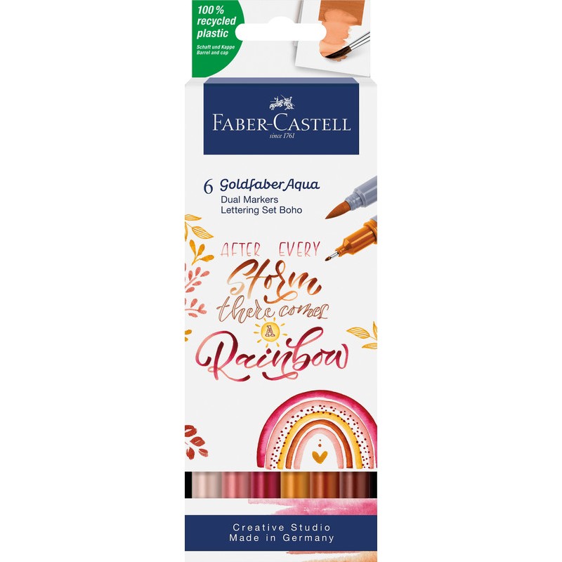 FABER-CASTELL Dual Marker Goldfaber Aqua Lettering Set Zweifunktionsmaler, Finelinerspitze 0,6 mm für Konturen und Details, Pinselspitze für feines, breites und flächiges Arbeiten, Tinte auf Wasserbasis, Verschlusskappe in der Schreibfarbe, wasservermalbar, geruchsneutral, säurefrei, pH-neutral, nicht nachfüllbar, 6 Farben sortiert, in Kartonetui. Nachhaltigkeit eco:plus: verlängertes Produktleben, recycelter Bestandteil, Recycelgehalt Abfall vor Gebrauch max. 50%, umweltfreundliche Verpackung.