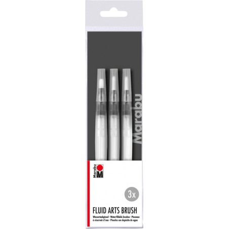 MARABU Wassertank-Pinsel Set Besatz aus feinen, elastischen Pinselhaaren, Stiel aus transparentem Kunststoff, Länge 110 mm, befüllbarer Wassertank, verwendbar mit allen wasserlöslichen Farben, ideal für unterwegs, Grössen sortiert. Set zu 3 Pinsel, rund 3 und 4 mm sowie flach 5 mm. Nachhaltigkeit eco:plus: recyclingfähig.