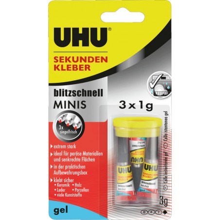 UHU® Sekundenkleber blitzschnell Minis Gel extra stark, tropffrei, klebt nahezu alle flexiblen, festen und porösen Materialien, wie Holz, Porzellan, Metall, Keramik, Leder, Kunststoff usw., ideal für senkrechte Flächen, in praktischer Aufbewahrungsbox.