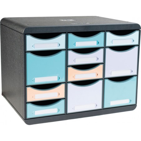 EXACOMPTA Schubladenelement Big-Box Multi Aquarel aus 80% recyceltem PS, langlebig, widerstandsfähig und stabil, geräuschfreier Schubladenlauf und Auszugsstopp, mit 11 Schubladen in unterschiedlichen Grössen, leicht offene Schubladenfronten für direktes Einlegen der Unterlagen ohne Öffnen der Schublade, Schubfächer mit Etikettenhalter. Masse: B 278 x H 347 x T 271 mm. 11 geschlossene Schubladen