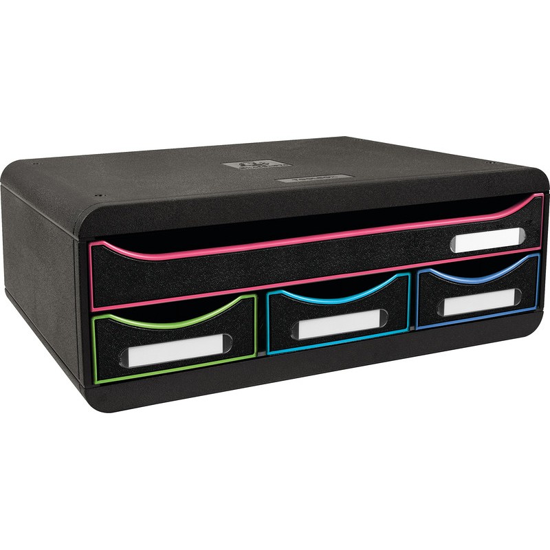 EXACOMPTA Schubladenelement Toolbox Mini aus PS, 4 Schubladen, leicht offene Schubladenfronten für direktes Einlegen der Unterlagen ohne Öffnen der Schubladen, Auszugsstopp, leicht offene Schubladenfronten für direktes Einlegen der Unterlagen ohne Öffnen der Schublade, stapelbar dank Aussparungen, Schubfächer mit Etikettenhalter. Masse: B 270 x H 355 x T 135 mm. Zertifikat: Der blaue Engel.
