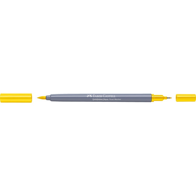 FABER-CASTELL Dual Marker Goldfaber Aqua Zweifunktionsmaler, Finelinerspitze 0,6 mm für Konturen und Details, Pinselspitze für feines, breites und flächiges Arbeiten, Tinte auf Wasserbasis, Verschlusskappe in der Schreibfarbe, wasservermalbar, geruchsneutral, säurefrei, pH-neutral, nicht nachfüllbar. Nachhaltigkeit eco:plus: verlängertes Produktleben, zurückgewonnene Energie, recycelter Bestandteil, Recycelgehalt Abfall vor Gebrauch max. 51%, Abfallminderung.