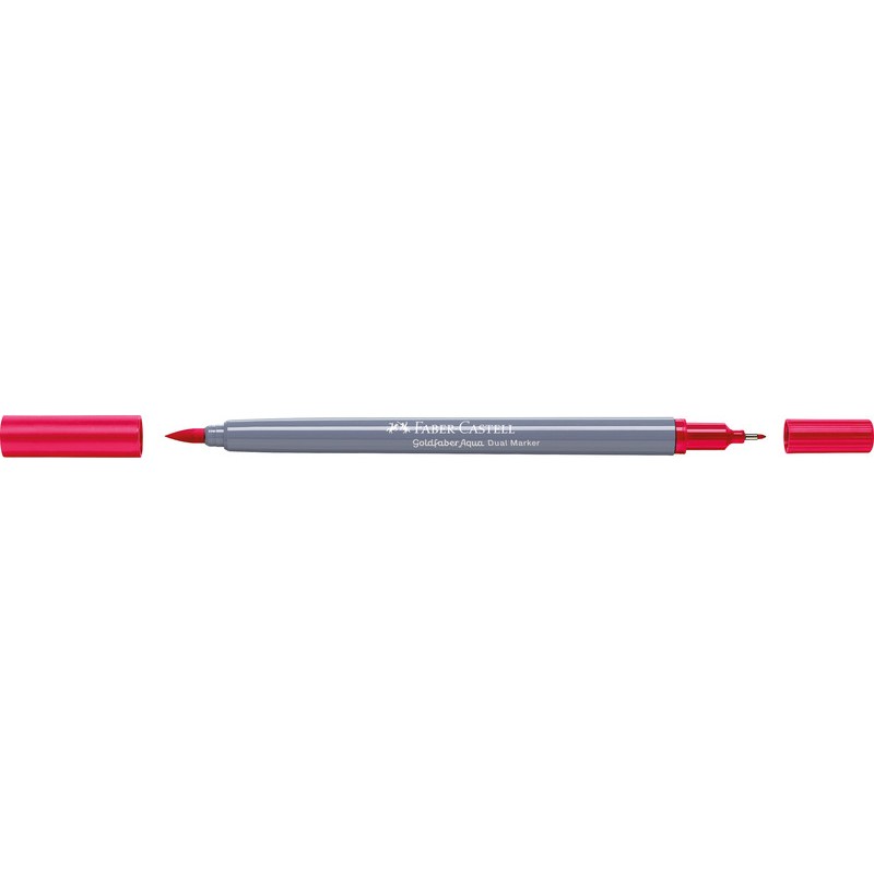 FABER-CASTELL Dual Marker Goldfaber Aqua Zweifunktionsmaler, Finelinerspitze 0,6 mm für Konturen und Details, Pinselspitze für feines, breites und flächiges Arbeiten, Tinte auf Wasserbasis, Verschlusskappe in der Schreibfarbe, wasservermalbar, geruchsneutral, säurefrei, pH-neutral, nicht nachfüllbar. Nachhaltigkeit eco:plus: verlängertes Produktleben, zurückgewonnene Energie, recycelter Bestandteil, Recycelgehalt Abfall vor Gebrauch max. 51%, Abfallminderung.
