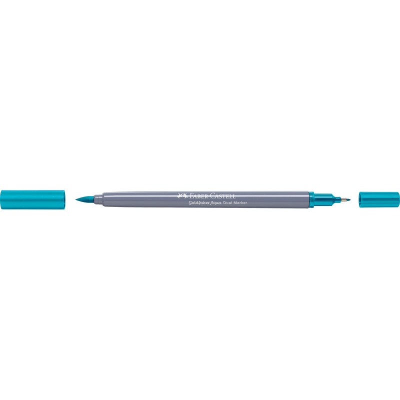 FABER-CASTELL Dual Marker Goldfaber Aqua Zweifunktionsmaler, Finelinerspitze 0,6 mm für Konturen und Details, Pinselspitze für feines, breites und flächiges Arbeiten, Tinte auf Wasserbasis, Verschlusskappe in der Schreibfarbe, wasservermalbar, geruchsneutral, säurefrei, pH-neutral, nicht nachfüllbar. Nachhaltigkeit eco:plus: verlängertes Produktleben, zurückgewonnene Energie, recycelter Bestandteil, Recycelgehalt Abfall vor Gebrauch max. 51%, Abfallminderung.