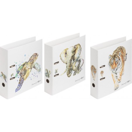 PAGNA® Ordner Save me No.3 aus Recyclingkarton, mit Raumsparösen und Griffloch, Hebelmechanik, mit Niederhalter, Rückenbreite 7,5 cm, 2-Ring-Mechanik, Ø 70 mm, für Format A4, 3 Motive sortiert. Masse: B 290 x H 320 x T 75 mm. Nachhaltigkeit eco:plus: recyclingfähig. No. 3