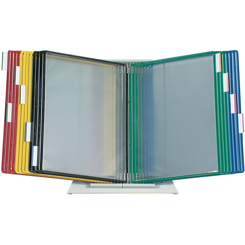 DJOIS tarifold Sichttafelsystem komplett mit 20 Drehtaschen aus Metall, lackiert. Set zu 2 Wandelementen 214100, Sockel 220000, Satz Seitenanschläge Pluggers grau 200000, 20 Drehtaschen für Format A4 114001 - 114007, je 2 schwarz, blau, gelb, grün und rot und 10 Reiter 50 mm. Garantie: 10 Jahre. Nachhaltigkeit eco:plus: verlängertes Produktleben, Recycelgehalt Abfall nach Gebrauch max. 21%, umweltfreundliche Verpackung.