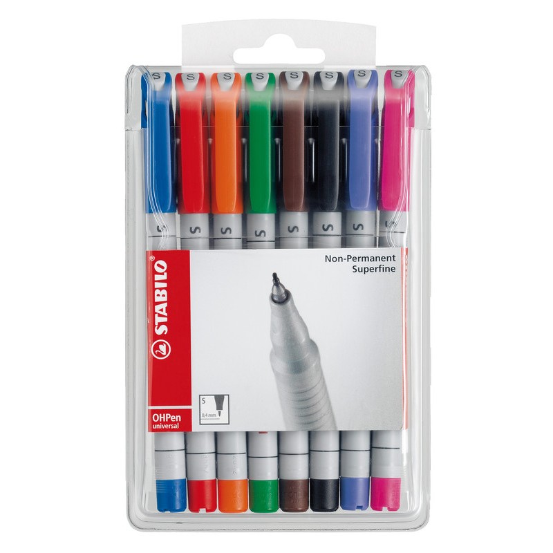 STABILO® OHPen universal wasserlöslich Clip, universell einsetzbarer Folienschreiber, nicht nur für Folien geeignet, sondern auch für den Einsatz auf fast allen glatten Oberflächen, wasserlösliche Tinte, feucht abwischbar, nicht nachfüllbar. Nachhaltigkeit eco:plus: umweltfreundliche Verpackung. superfein (S), Strichbreite ca. 0,4 mm