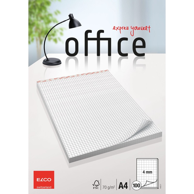ELCO Notizblock Office mit Deckblatt Papier hochweiss, 70 g/m2, 4 mm kariert, 100 Blatt, auf Kartonunterlage geheftet, perforierter Abriss und Leinwandrücken. Nachhaltigkeit eco:plus: recyclingfähig. Zertifikat: FSC.