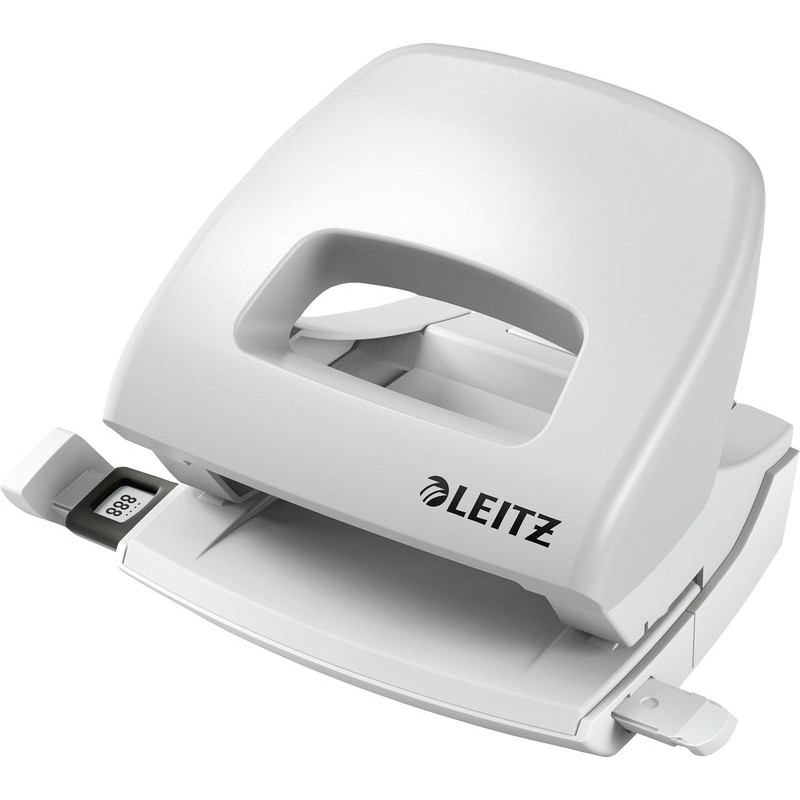 LEITZ® NeXXt Serie kleiner Locher 5038 Unterteil aus Metall, Griff aus ABS mit Metallbügel, für 8 cm Lochabstand, Loch Ø 5,5 mm, Anschlagschiene mit farbiger Bedruckung und Fenster, ultra-scharfe Lochstempel, patentierte Griffmulde für leichtes Lochen, Stanzvermögen 1,6 mm (16 Blatt). Garantie: 10 Jahre. Zertifikat: GS.