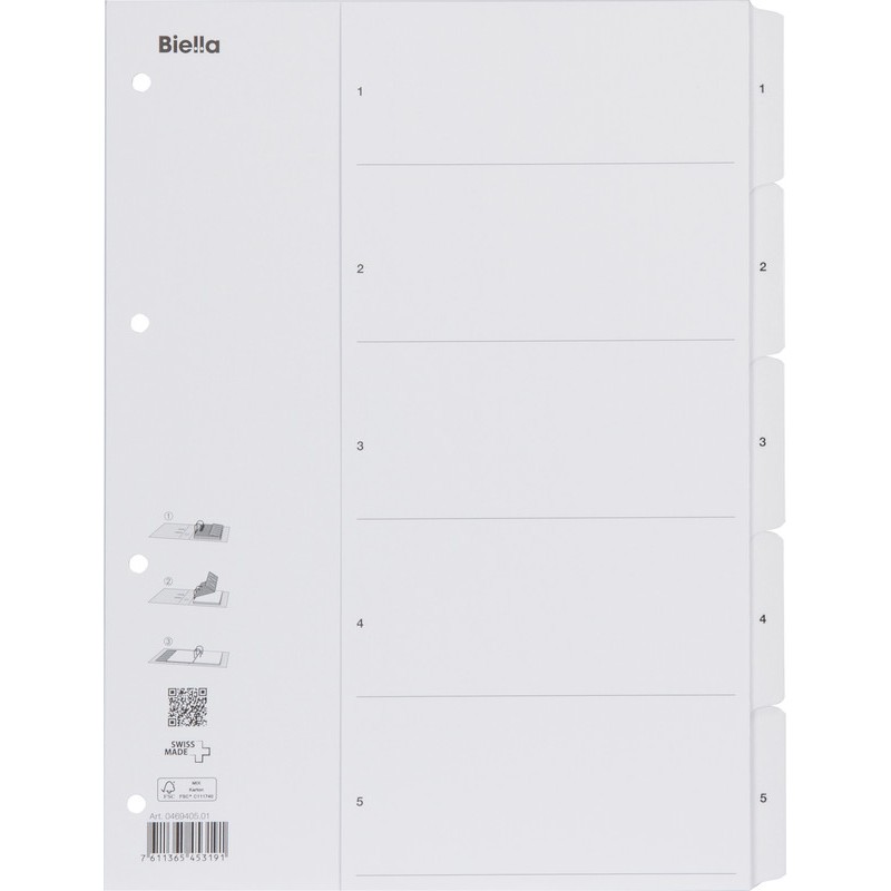 BIELLA Register Vollformat SmartIndex aus Karton, 160 g/m2, weiss, Taben verstärkt und schmutzabweisend, mit aufklappbarem SmartIndex, lesbar auch bei aufgeschlagenem Ordnerinhalt. Nachhaltigkeit eco:plus: Zertifikat: FSC.