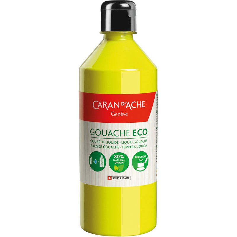 CARAN D'ACHE Gouache flüssig Eco lichtechte Farbe aus 80% natürlichen Inhaltsstoffen (ausser Neonfarben), wasserlöslich, hohe Deckkraft auch bei fünffacher Verdünnung mit Wasser, Dosierkopf für exaktes, sparsames Dosieren, haftet auf Papier, Karton, Holz, Glas, Metall, Salzteig etc., mit Seifenwasser von Händen, Böden und Tischen entfernbar, Flasche aus PET ohne BPA und Phthalate. Flasche zu 500 ml. Nachhaltigkeit eco:plus: umweltfreundliche Verpackung.