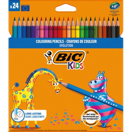 BIC® Farbstifte Evolution Kids widerstandsfähiger Farbstift aus Kunstharz, bruchsichere Mine, bissfeste Oberfläche, ideal für Kinder. Nachhaltigkeit eco:plus: recycelter Bestandteil, Recycelgehalt Abfall vor Gebrauch max. 50%. Zertifikat: NF Environment.