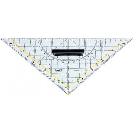 LINEX® Geometrie-Dreieck 225 aus glasklarem PS, Masseinteilung schwarz, Tuschekanten und Facetten an allen 3 Kanten, mit abnehmbarem Griff.